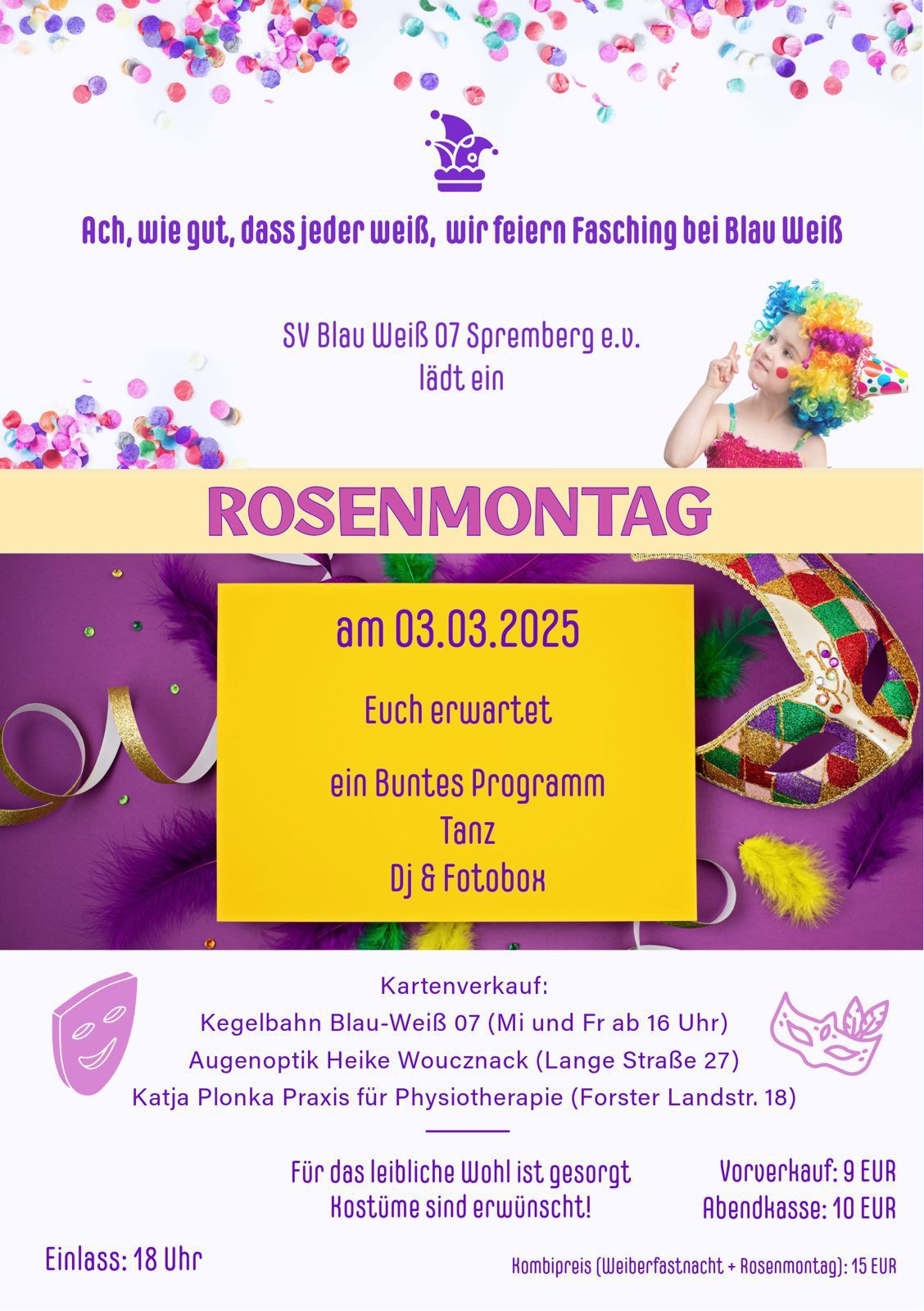 | | Alles anzeigen | | | | 2025-01-20 17:39:00, Dorina | |  | Am 03.03.2025 veranstalten die Abteilung Kultur & Brauchtum und die Schilfhütte einen Rosenmontag auf Blau-Weiß ...