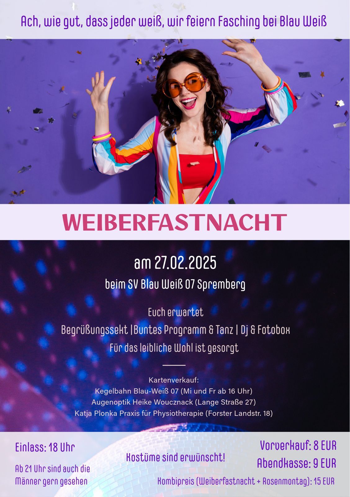 | | | | 2025-01-20 17:39:00, Dorina | |  | Die Abteilung Kultur & Brauchtum lädt am 27.02.2025 zum Weiberfasching in die Schilfhütte ein.