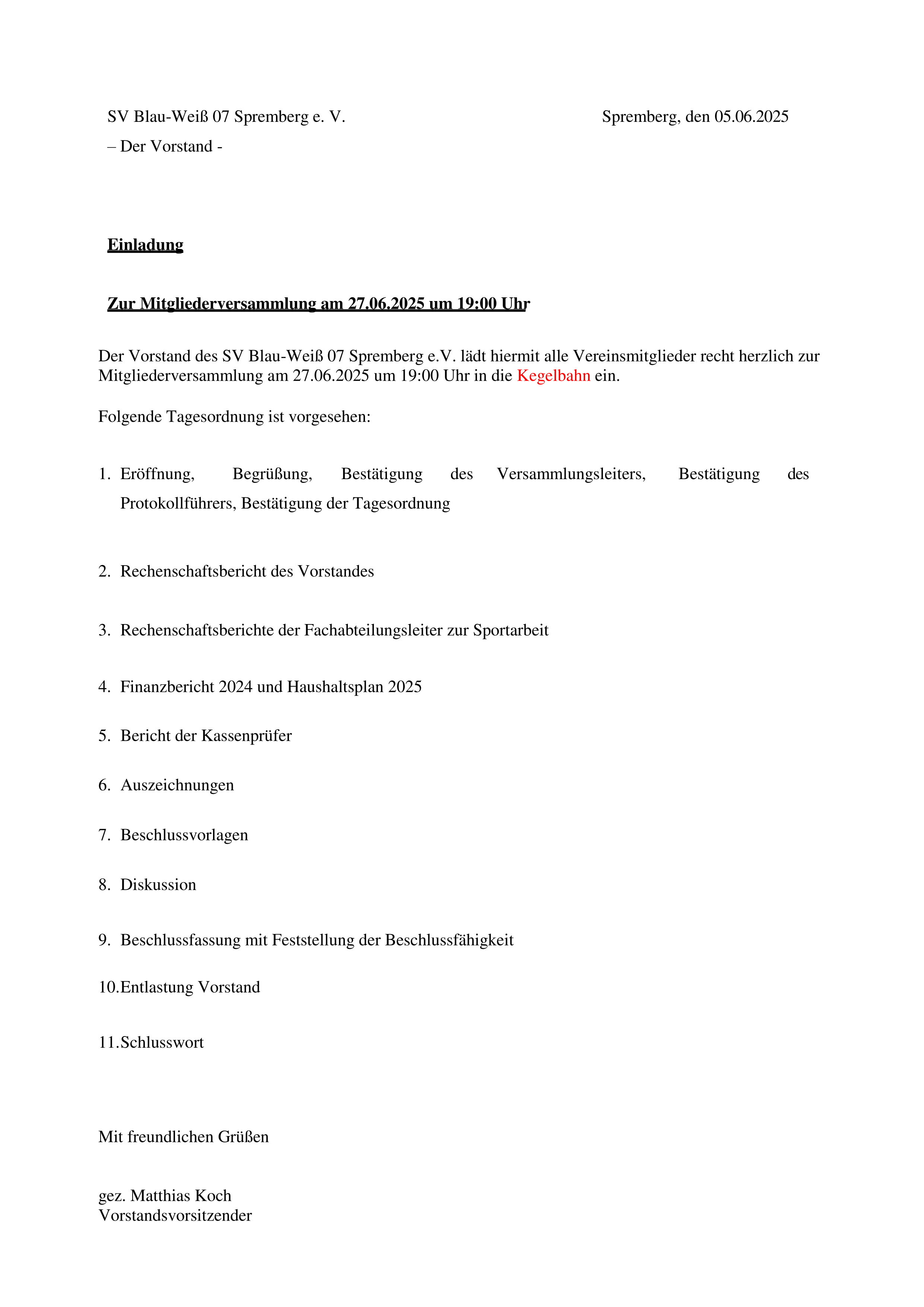 Einladung zur Mitgliederverammlung am 27.Juni um 19:00 Uhr in der Kegelbahn